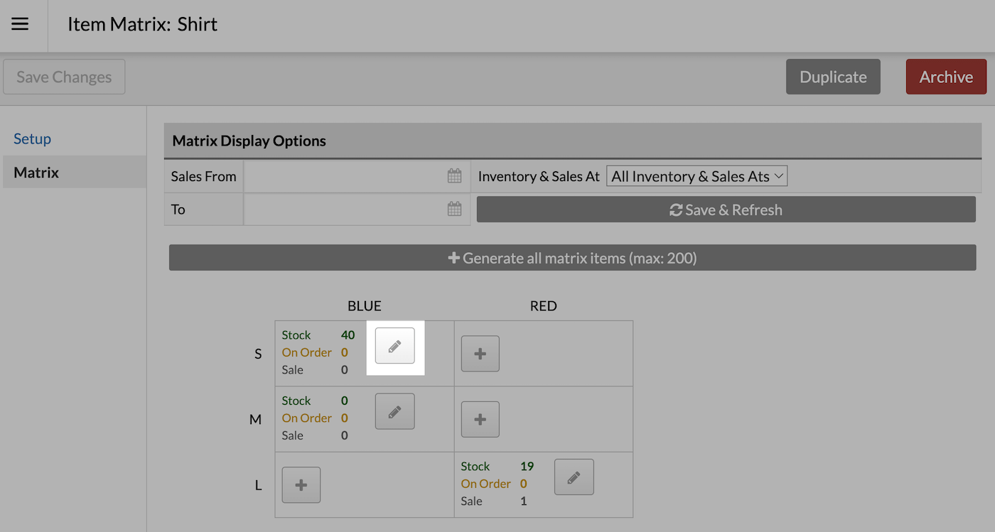 - Click the pencil icon next to the matrix SKU you want to edit and the Item Matrix Details page displays.