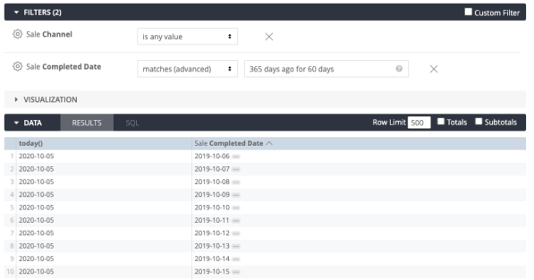 Now if I Run the report, we get a sample of sales beginning on 365 days ago, with those of the subsequent 59 days. We could do the same thing for weeks, months, or even years.