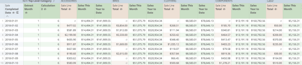 A good way to gather sales data from different time frames is to sum their respective totals, and then show only the first line of totals in the visualization.