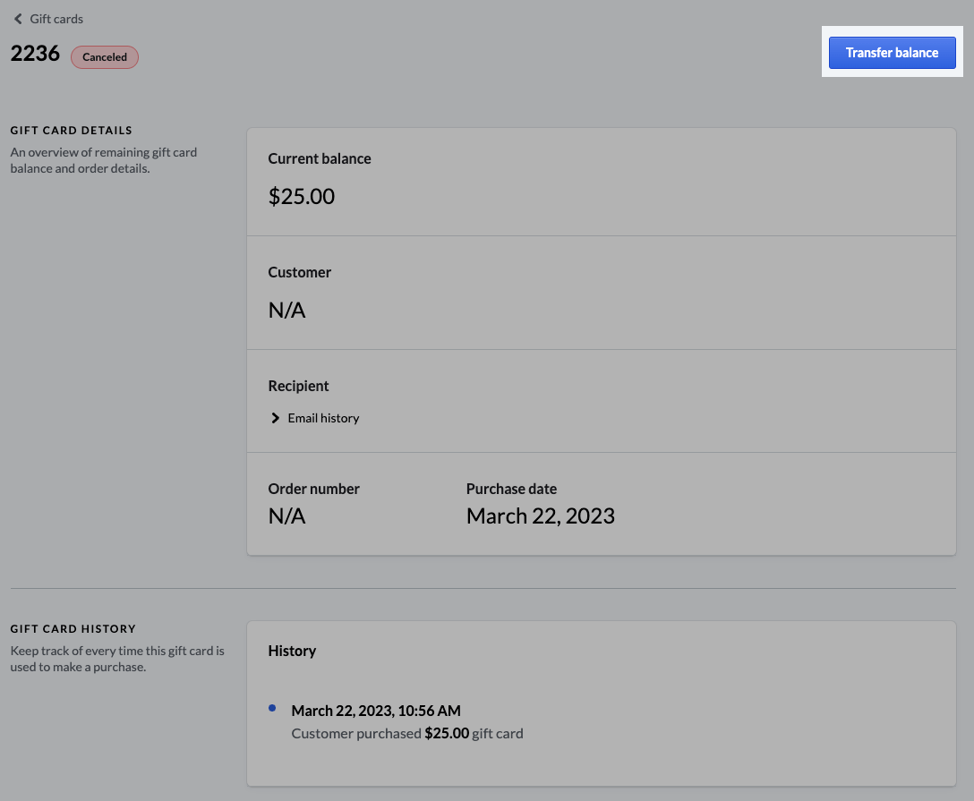On the Gift card details page for a specific gift card, you can view the current balance, any customer ID attached to the sale, email purchase history, purchase date, and gift card history. You can also resend a gift card by selecting Email gift card and/or cancel the gift card.