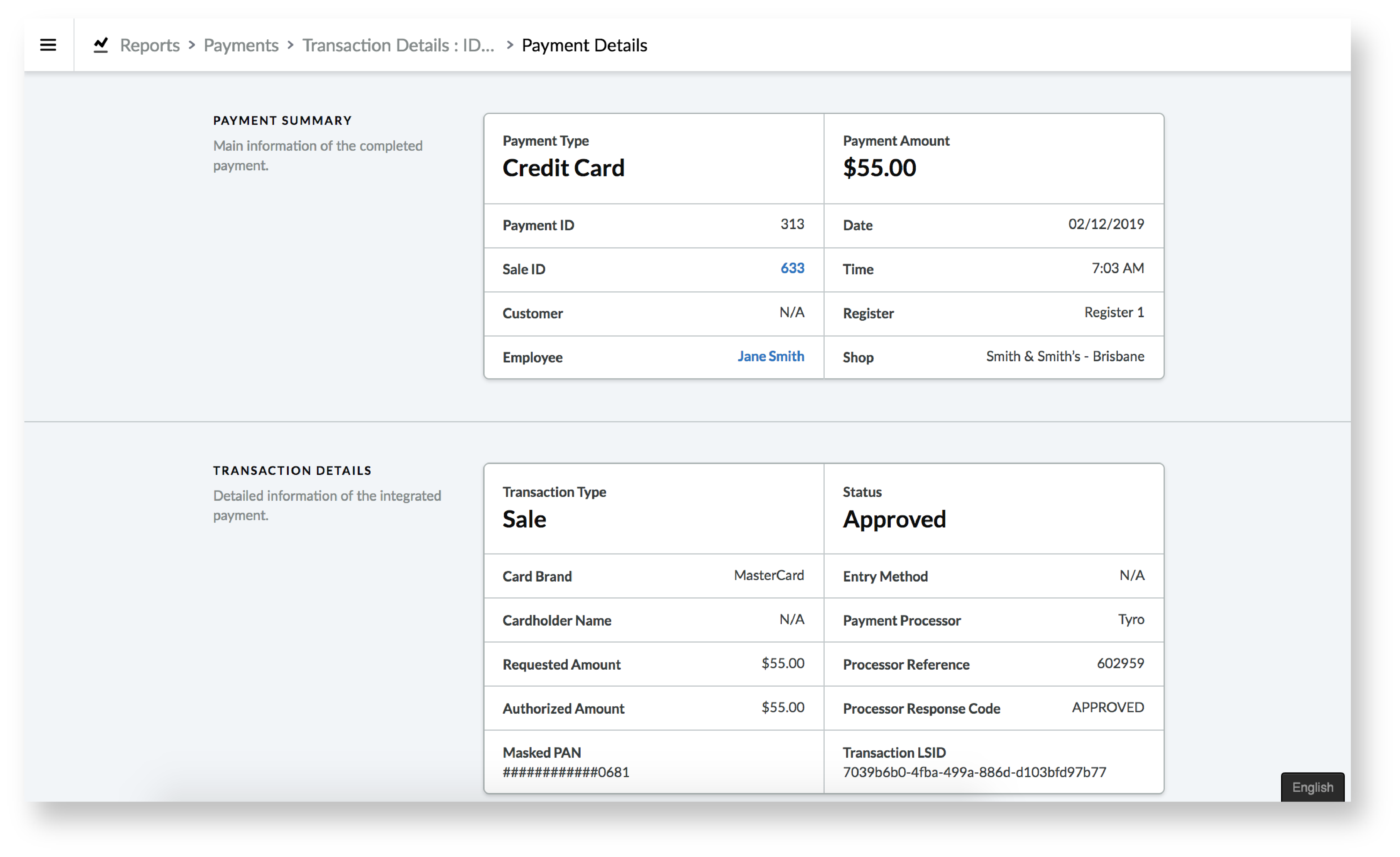 Si vous ou votre client ne disposez pas du reçu du terminal de paiement Tyro, vous pouvez cliquer sur l’ID du paiement(dans la colonne ID) pour afficher les détails du paiement Tyro associé. Vous pouvez ensuite rechercher les détails de ce paiement Tyro (p. ex. la Processor reference (référence du processeur) est la référence de la transaction Tyro) dans le portail marchand Tyro pour trouver la transaction Tyro associée.