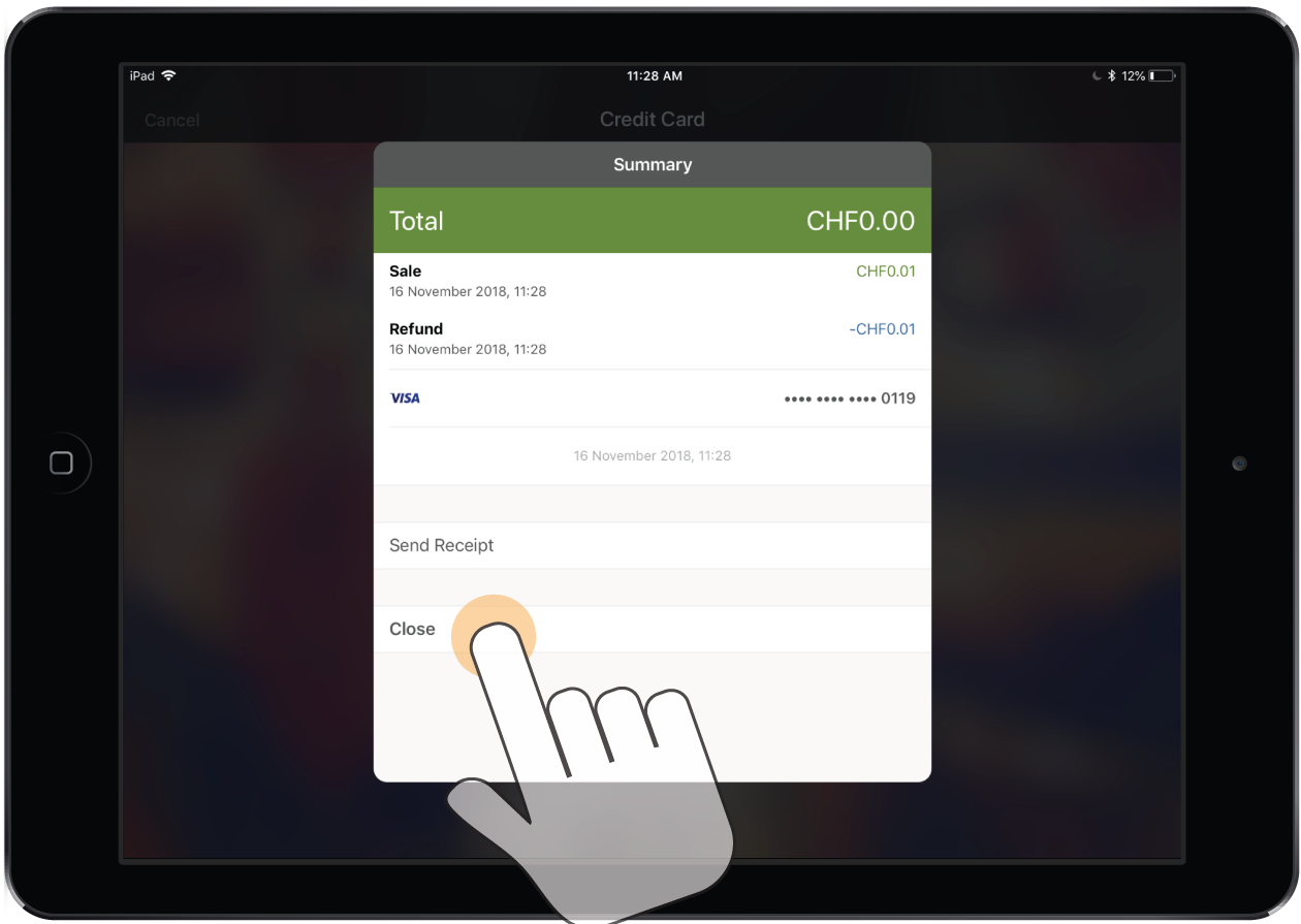 - L’écran Summary (résumé) dans l’application PDV détaillants vous confirme que le paiement est remboursé. Le total s’élève désormais à CHF0.00.
