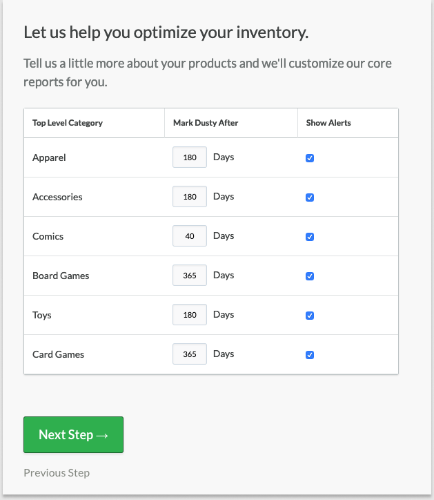 - Pour chacune de vos catégories de stock, indiquez la durée pendant laquelle un article peut rester en rayon avant d’être considéré comme obsolète dans la colonne Mark Dusty After (marquer comme obsolète après). Cela a une répercussion sur les articles présents dans le rapport Dusty Inventory (stocks obsolètes).