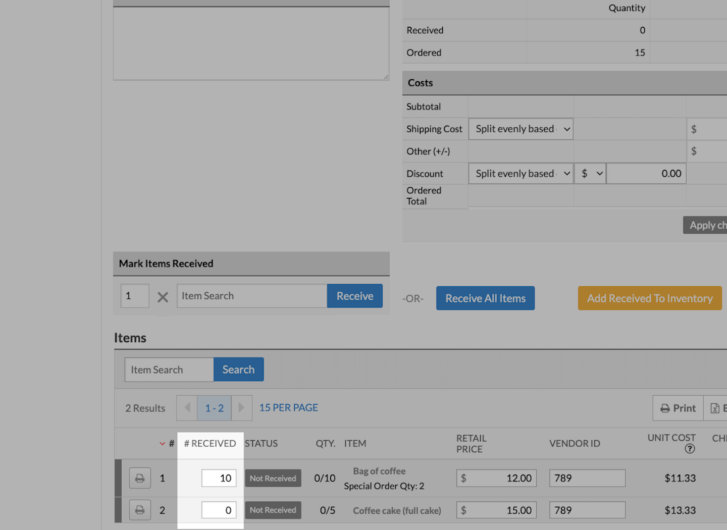 Il peut arriver que vous deviez vendre des articles qui n’ont pas encore été marqués comme réceptionnés. Si certaines unités d’un bon de commande n’ont pas été enregistrées, vous pouvez tout de même les ajouter à une vente. PDV détaillants marquera automatiquement les unités du bon de commande comme réceptionnées une fois la vente terminée.