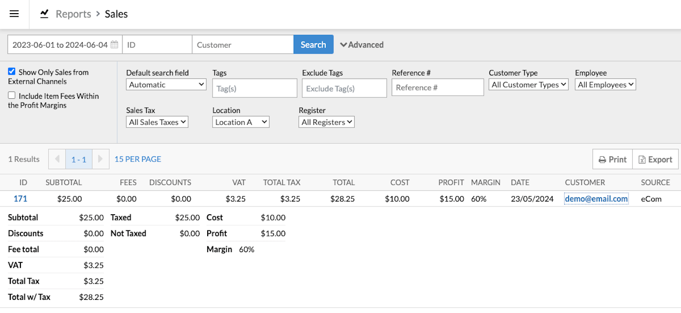 - La colonne Source se trouve tout à droite du tableau. La mention Commerce électronique identifie les ventes provenant de votre boutique en ligne. Cette information est comprise dans les rapports exportés.