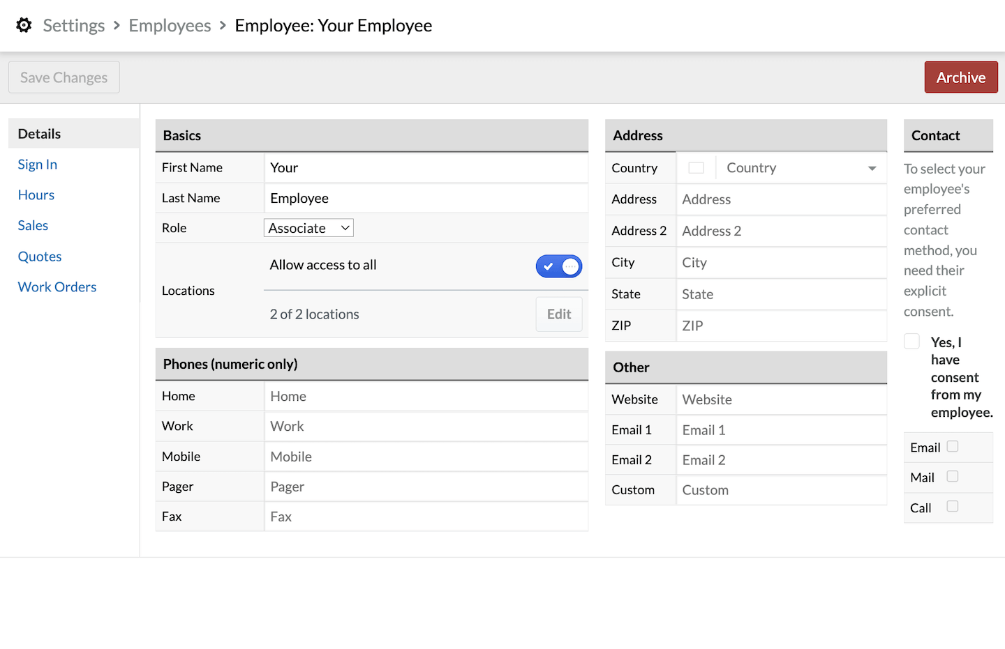 - Selecteer in de sectie contact de voorkeurscontactmethode van je werknemer (E-mailen, post versturen of bellen) voor software-updates en belangrijke berichten van Lightspeed Retail. De nadrukkelijke toestemming van je werknemer is vereist om contact met hem/haar op te nemen via deze methoden.
