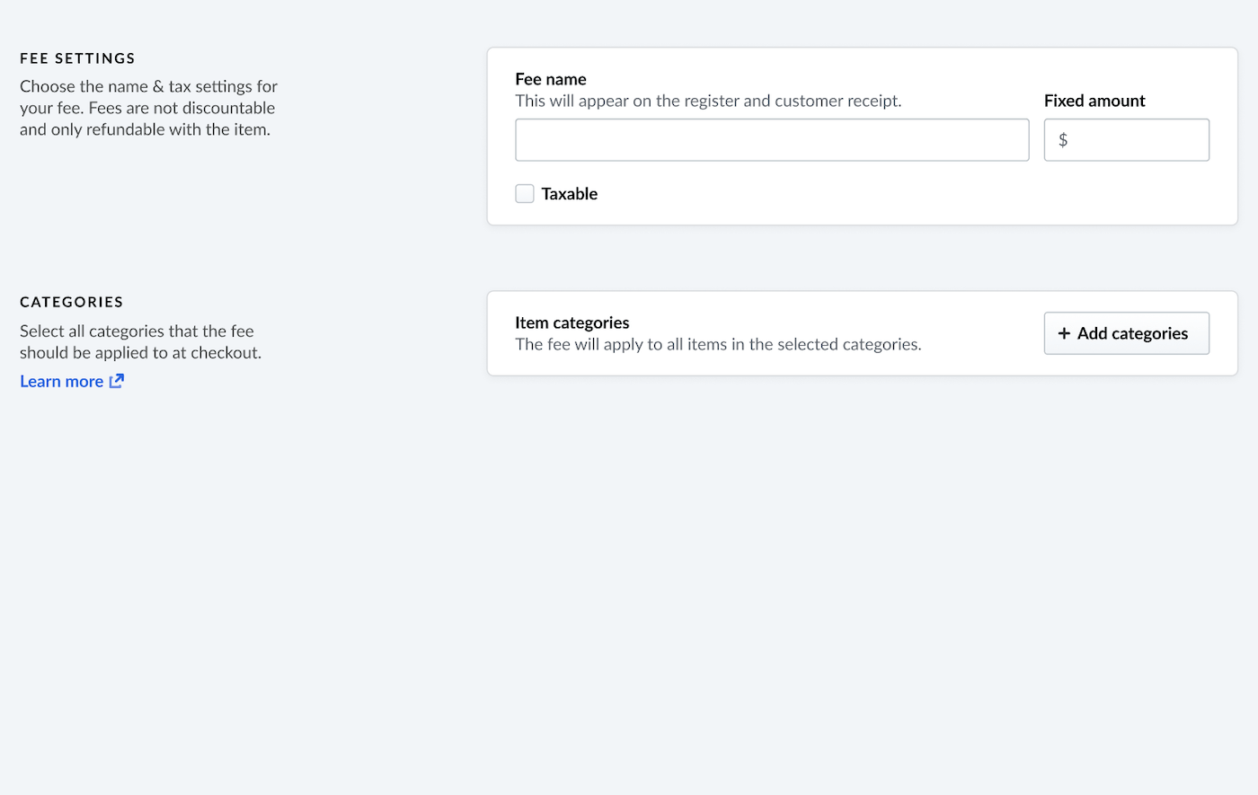 - Om de kosten automatisch te laten gelden voor items in een bepaalde categorie bij de kassa, klik op + Add categories (+ Categorieën toevoegen).