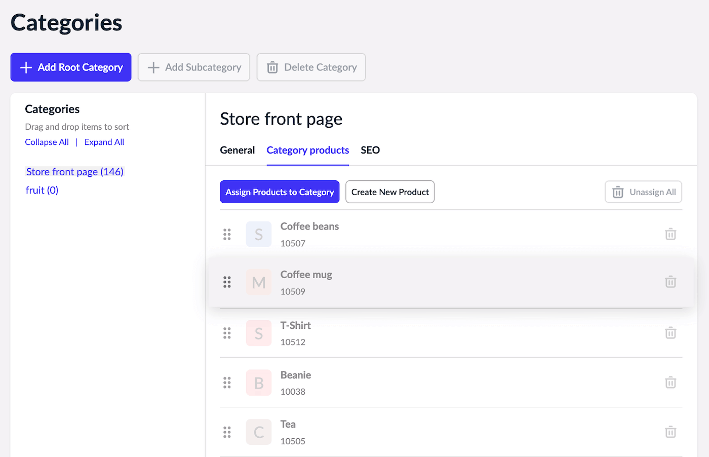 De productlijst op de pagina Catalogus > Categorieën in het eCom-beheerderspaneel is opnieuw ontworpen om het sorteren van producten sneller en eenvoudiger te maken.