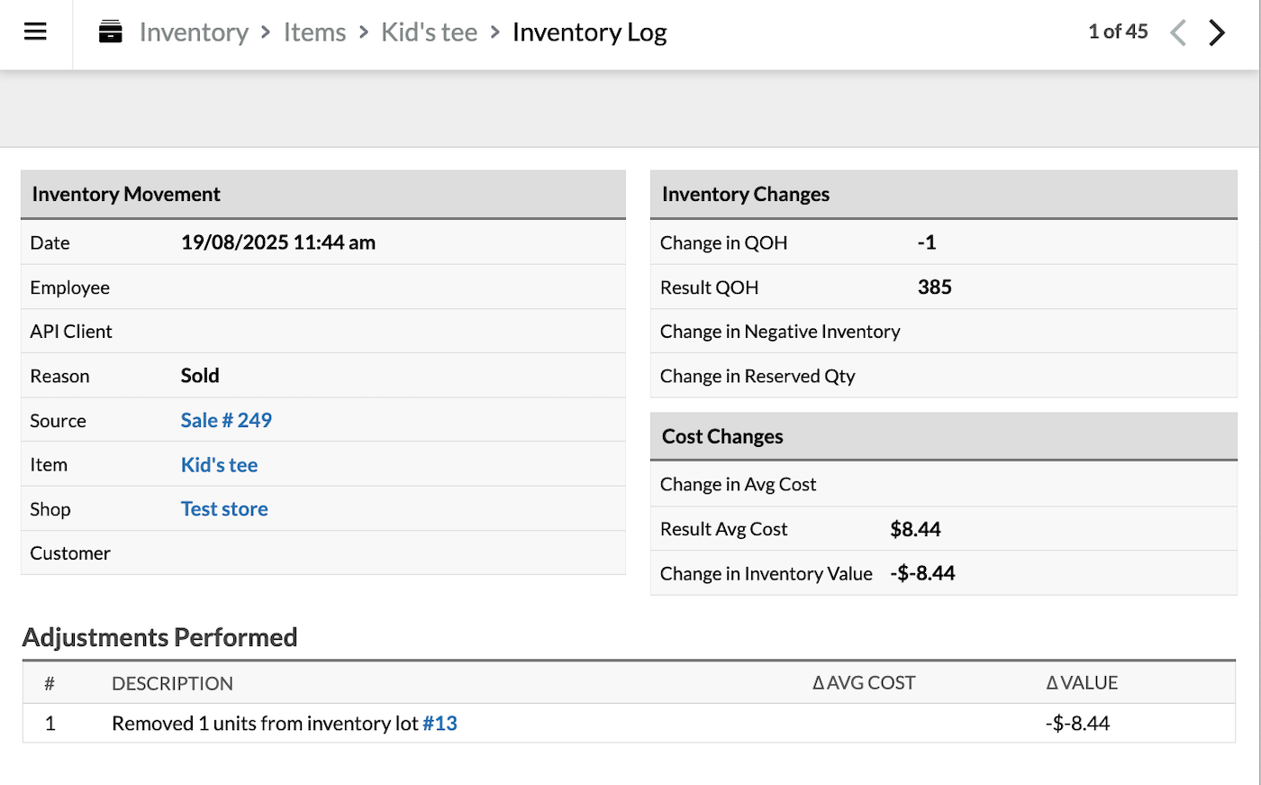 - Klik op een ID-nummer om een gedetailleerde weergave van de gebeurtenis te openen, inclusief het resulterende voorraadaantal en de resulterende gemiddelde kosten nadat de voorraadverplaatsing is voltooid, evenals details over aanpassingen aan afzonderlijke voorraadpartijen en registraties van negatieve voorraad om de actie uit te voeren.