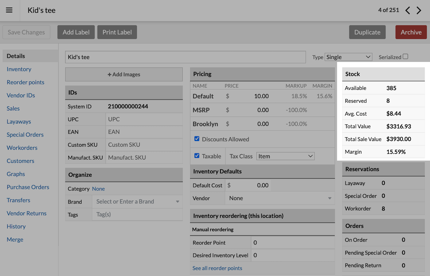 - Margin: geschat percentage van de verkoopprijs dat winst is. Als er voorraad beschikbaar is, wordt dit gebaseerd op de totale kosten van de verkoopbare voorraad en het standaardprijsniveau van de winkel. Als er geen voorraad beschikbaar is, wordt er een schatting gegeven op basis van de instellingen voor kostencontrole van de account.