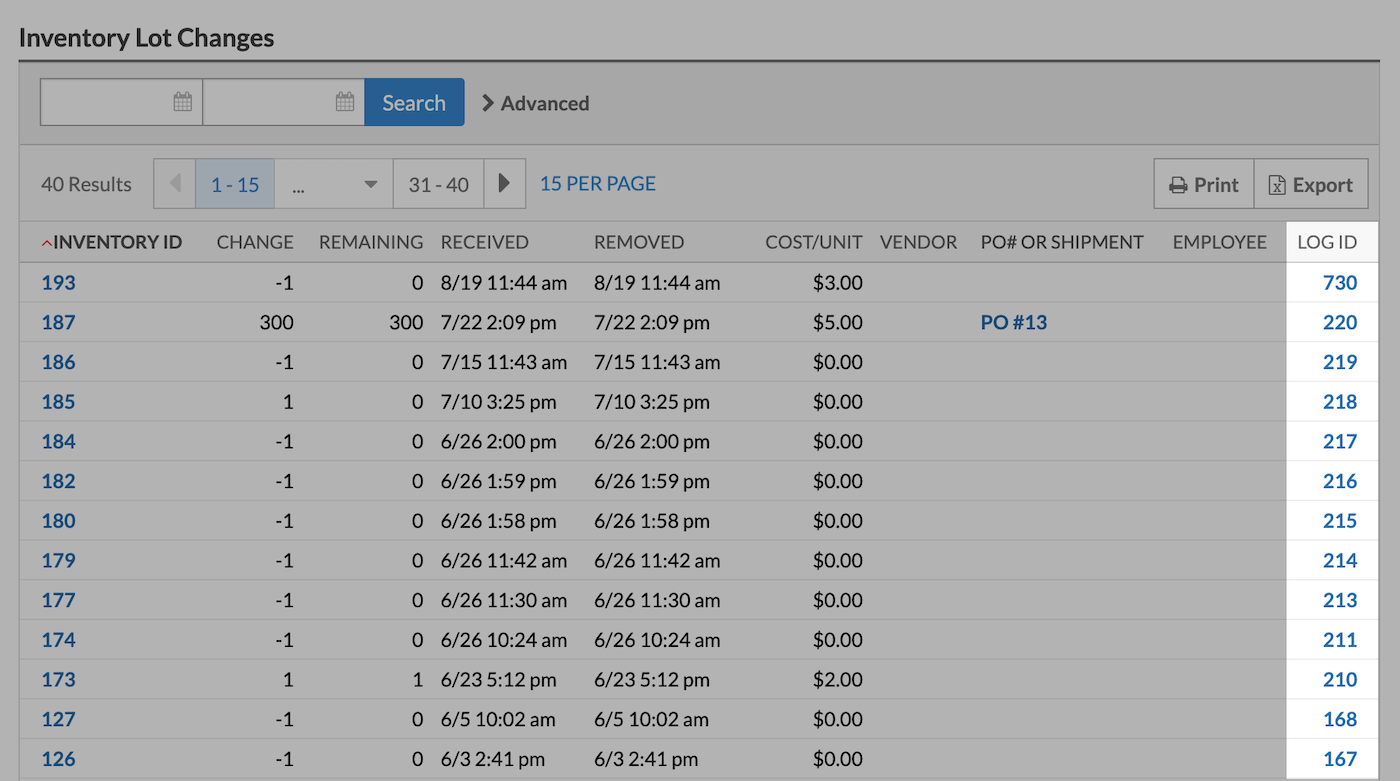 Je kunt ook op de Log ID in de laatste kolom van de tabel Inventory Lot Changes (Wijzigingen voorraadpartij) klikken om naar de voorraadlog te gaan die de aanpassing heeft veroorzaakt.