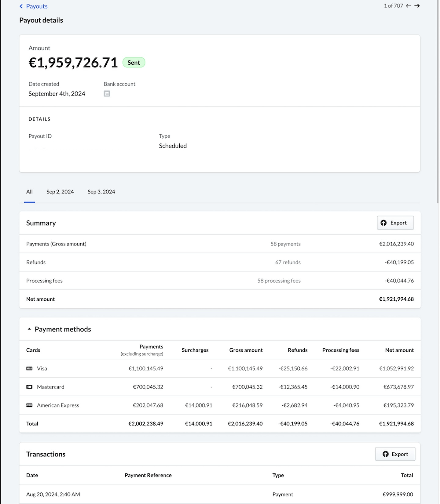 Klik voor meer informatie over een specifieke uitbetaling op de datum- en tijdhyperlink. Dit omvat het volledige betalingsbedrag, een overzicht van de kosten (inclusief brutobedrag, terugbetalingen, verwerkingskosten en nettobedrag), de gebruikte betaalmethoden en een lijst van transacties met betalingsreferenties. Als toeslagen worden ondersteund, bevat het rapport ook de bedragen van de toeslagen.